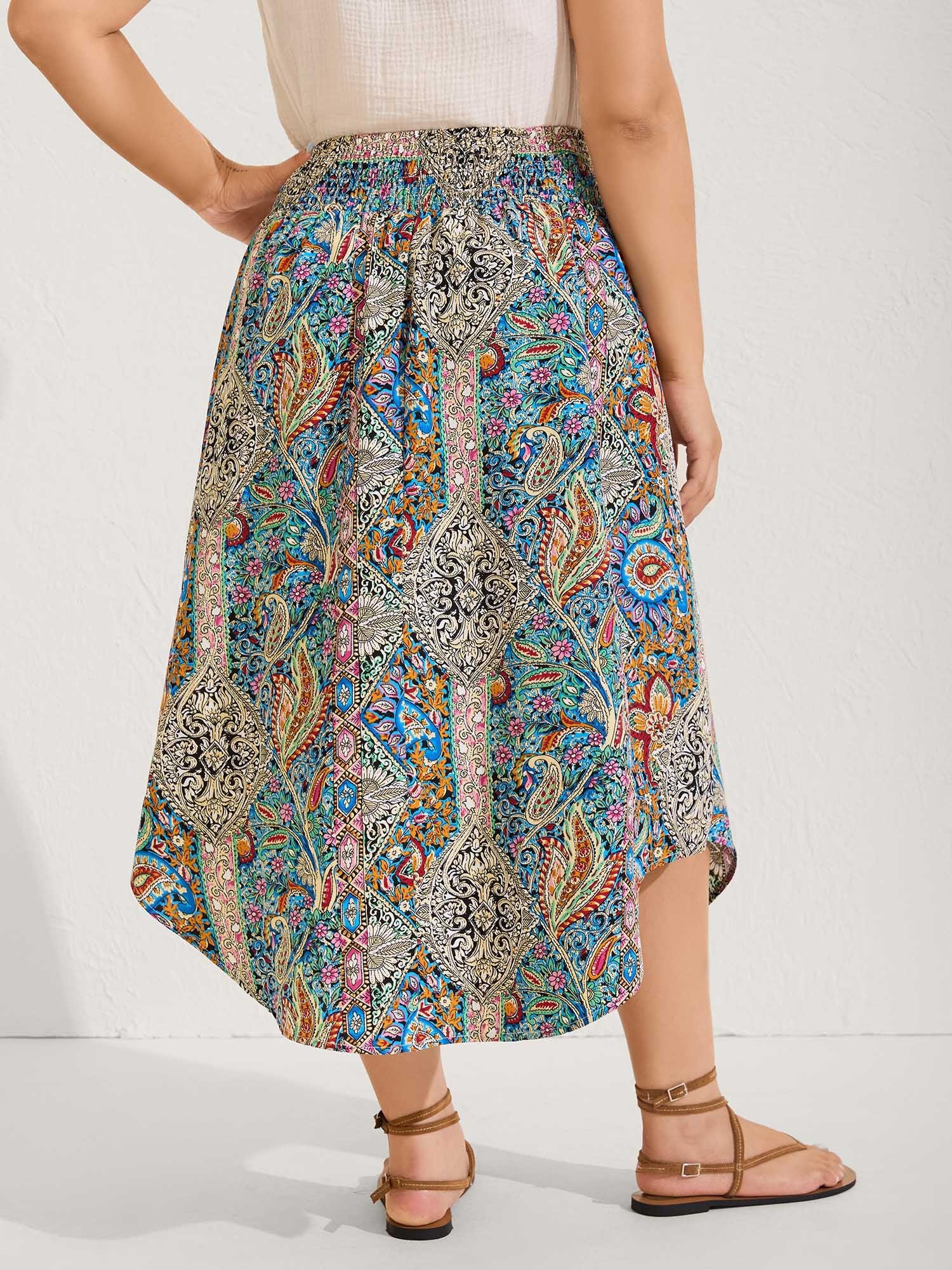 Boho Print Shirred Waist Midi Skirt