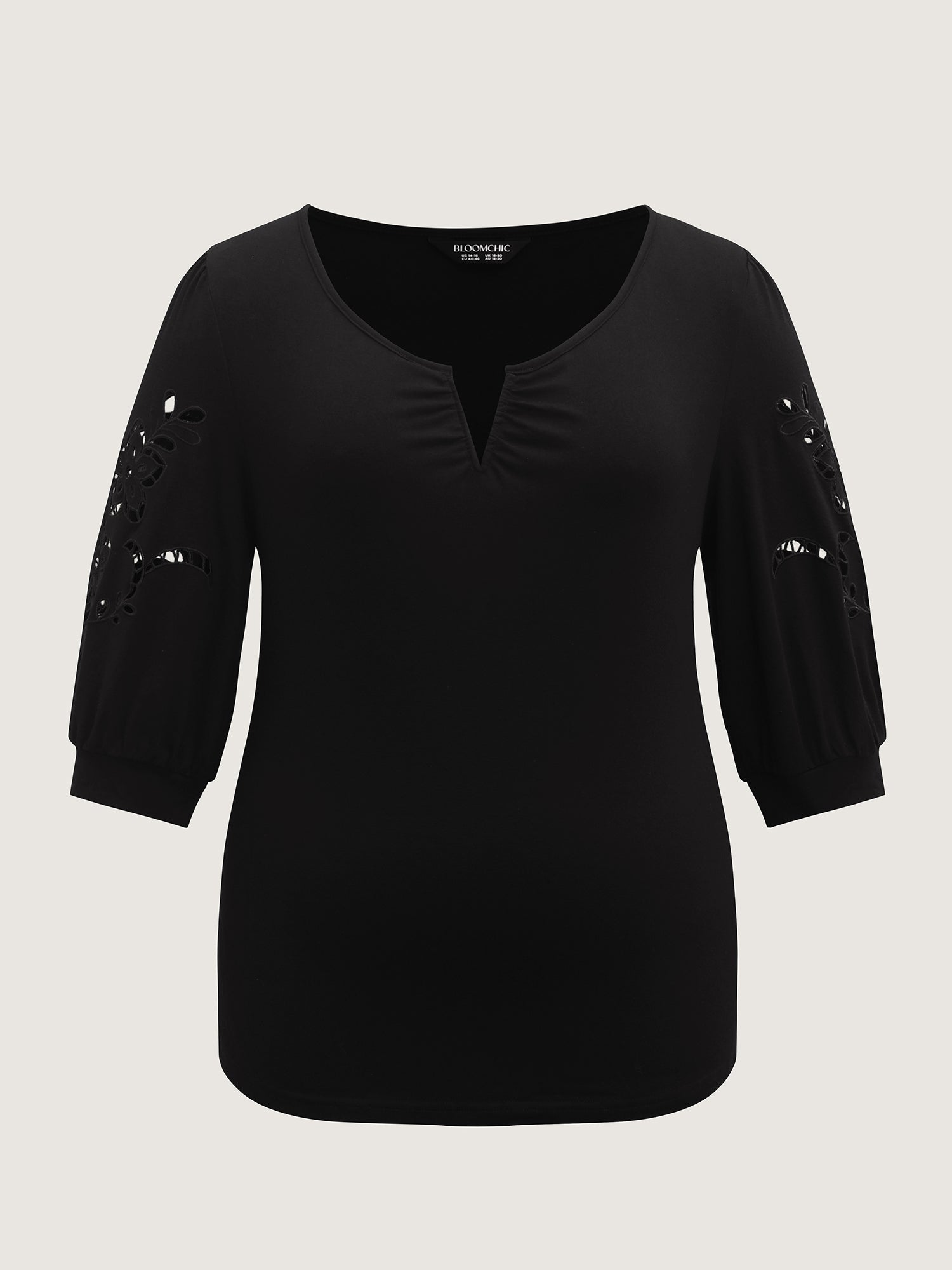 Cut-Out Embroidery Sleeve Solid T-Shirt