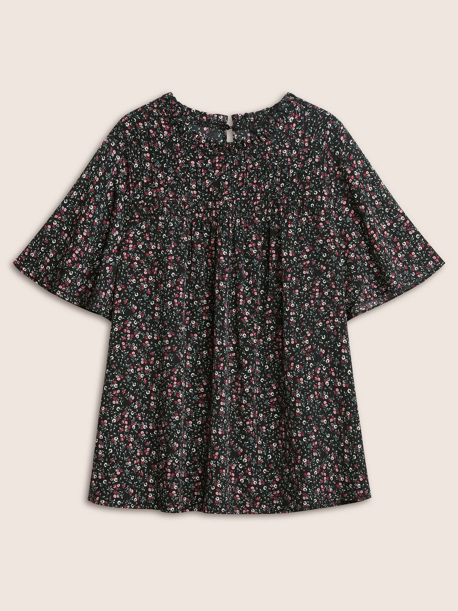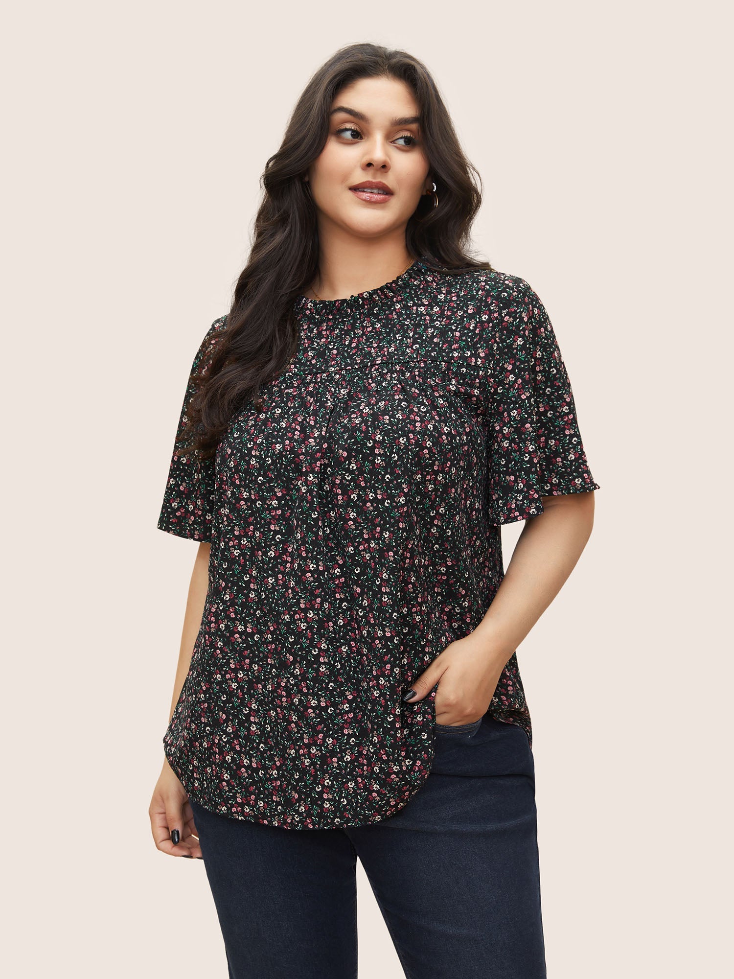 Ditsy Floral Plicated Detail Frill Trim Blouse