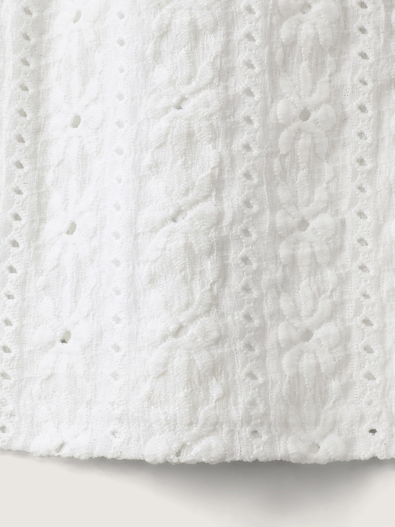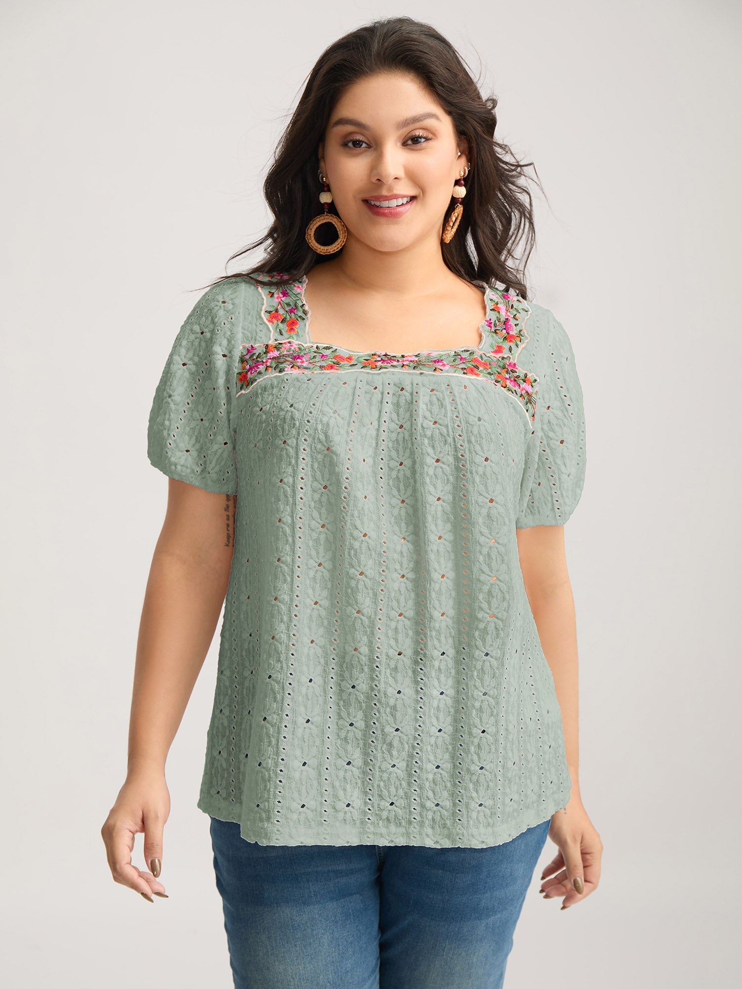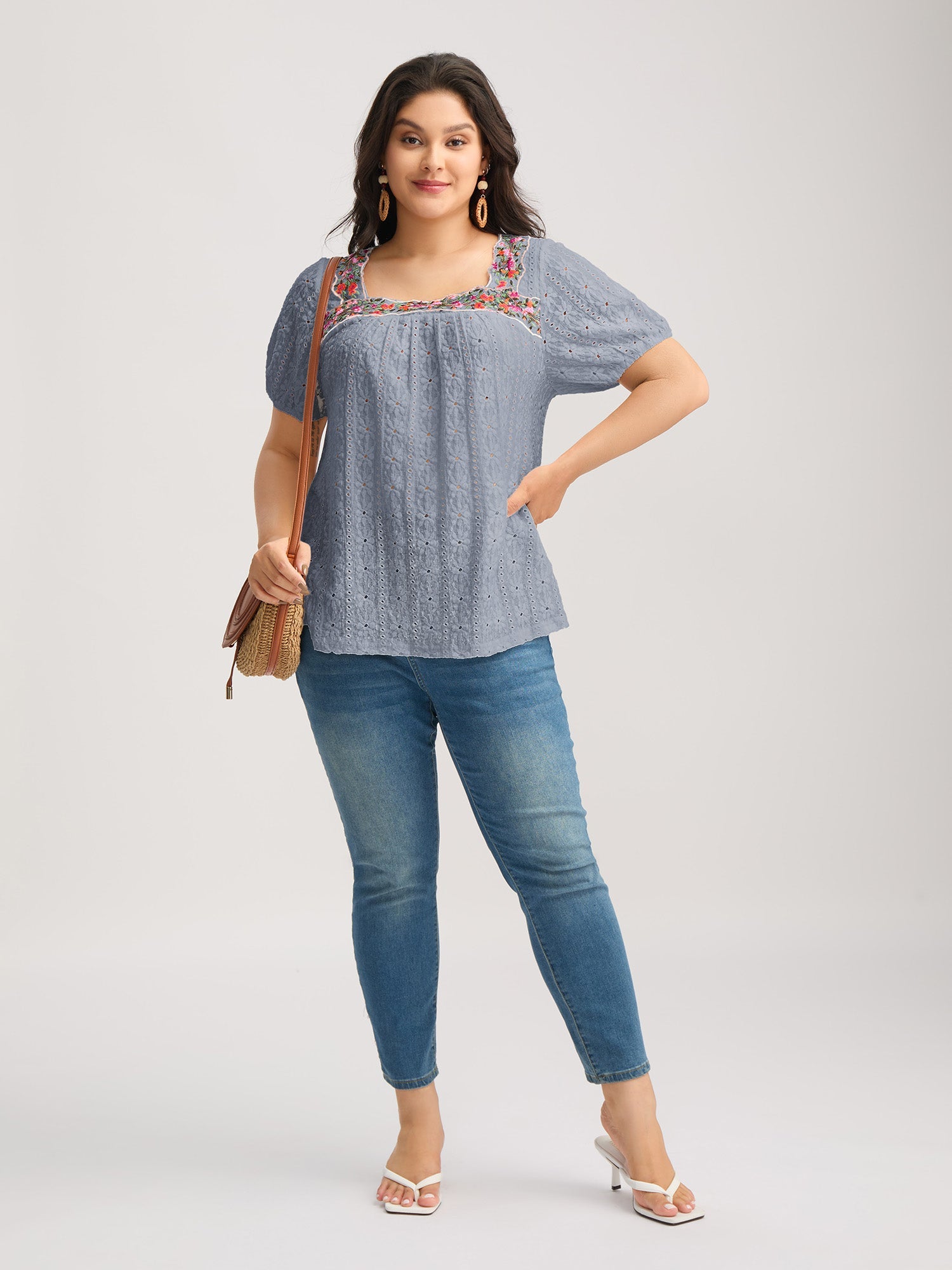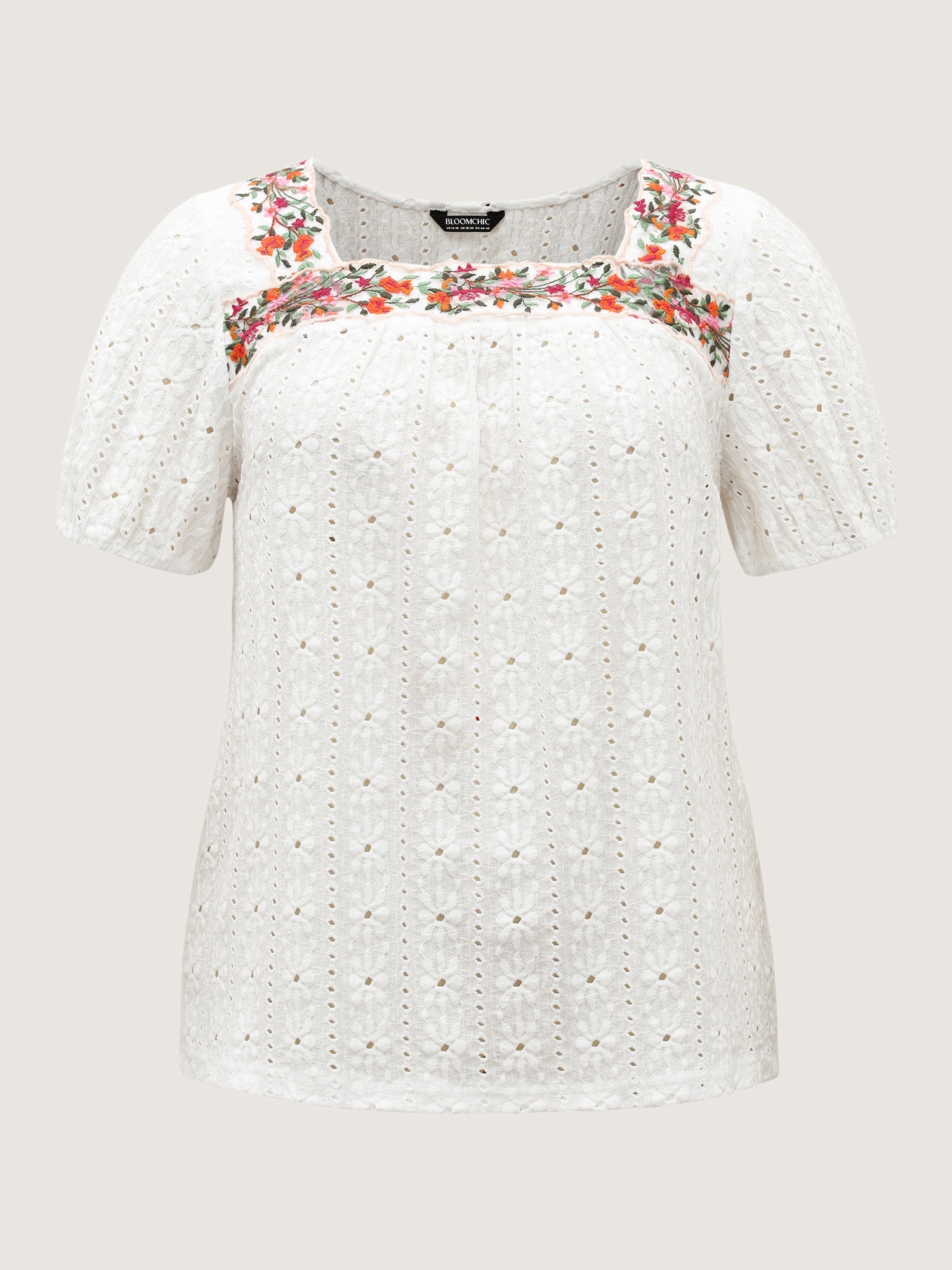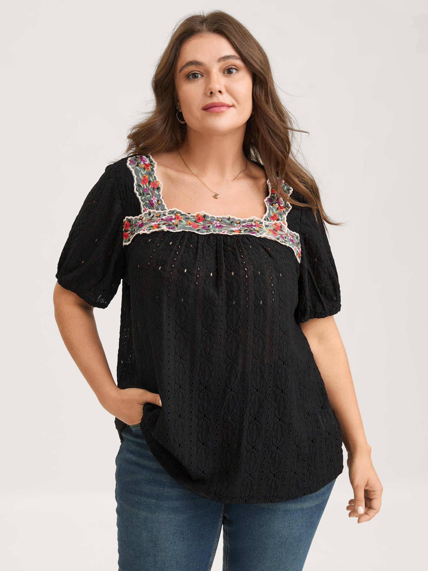 Eyelet Trim Floral Embroidered Solid T-Shirt