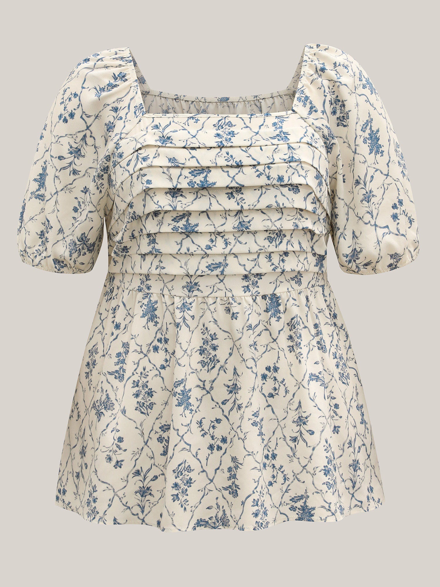 Floral Pleated Bodice Puffy Sleeve Blouse