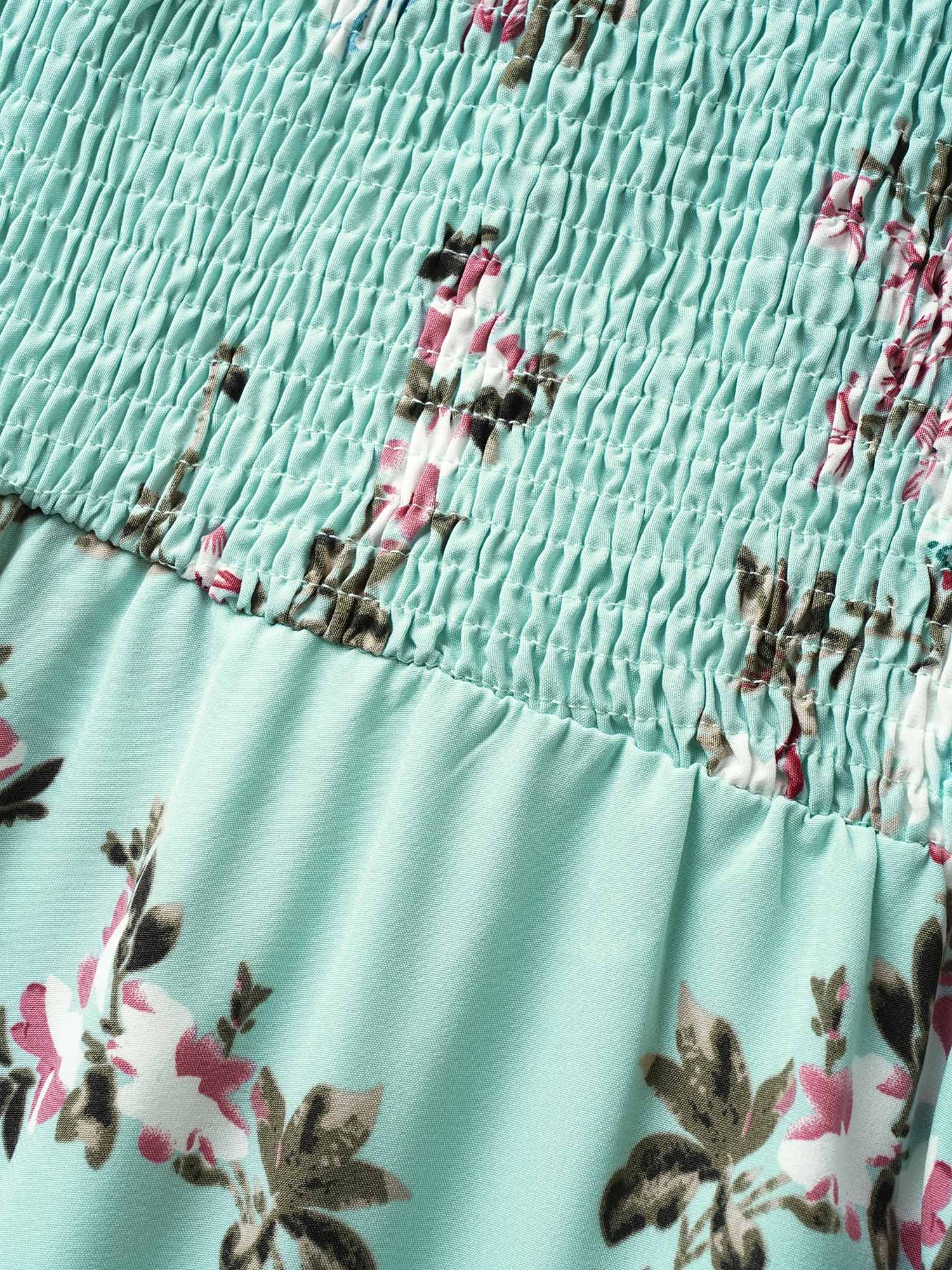 Floral Square Neck Ruffles Pocket Shirred Split Dress