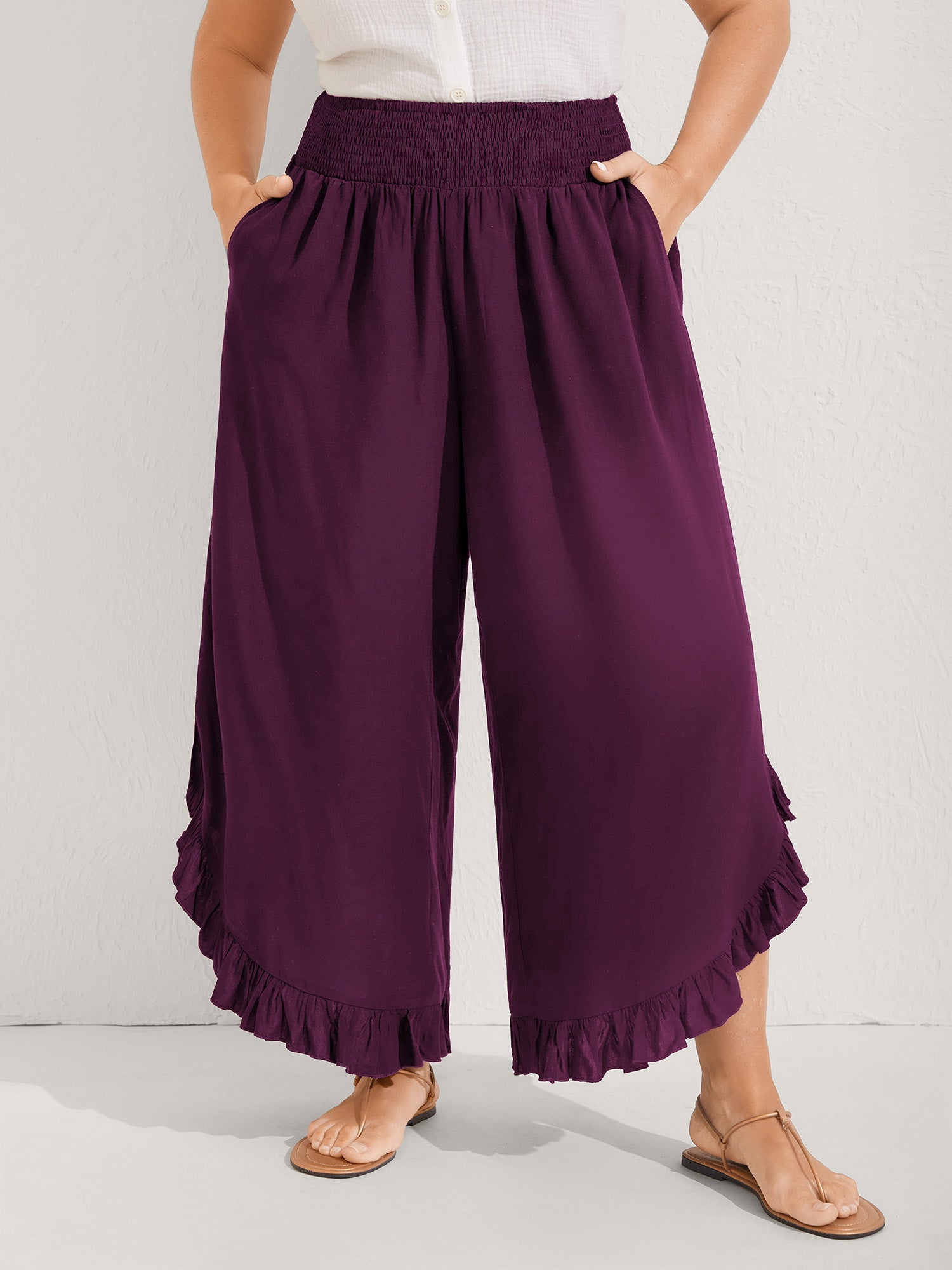 Ruffled Curvy Hem Wide-Leg Pants