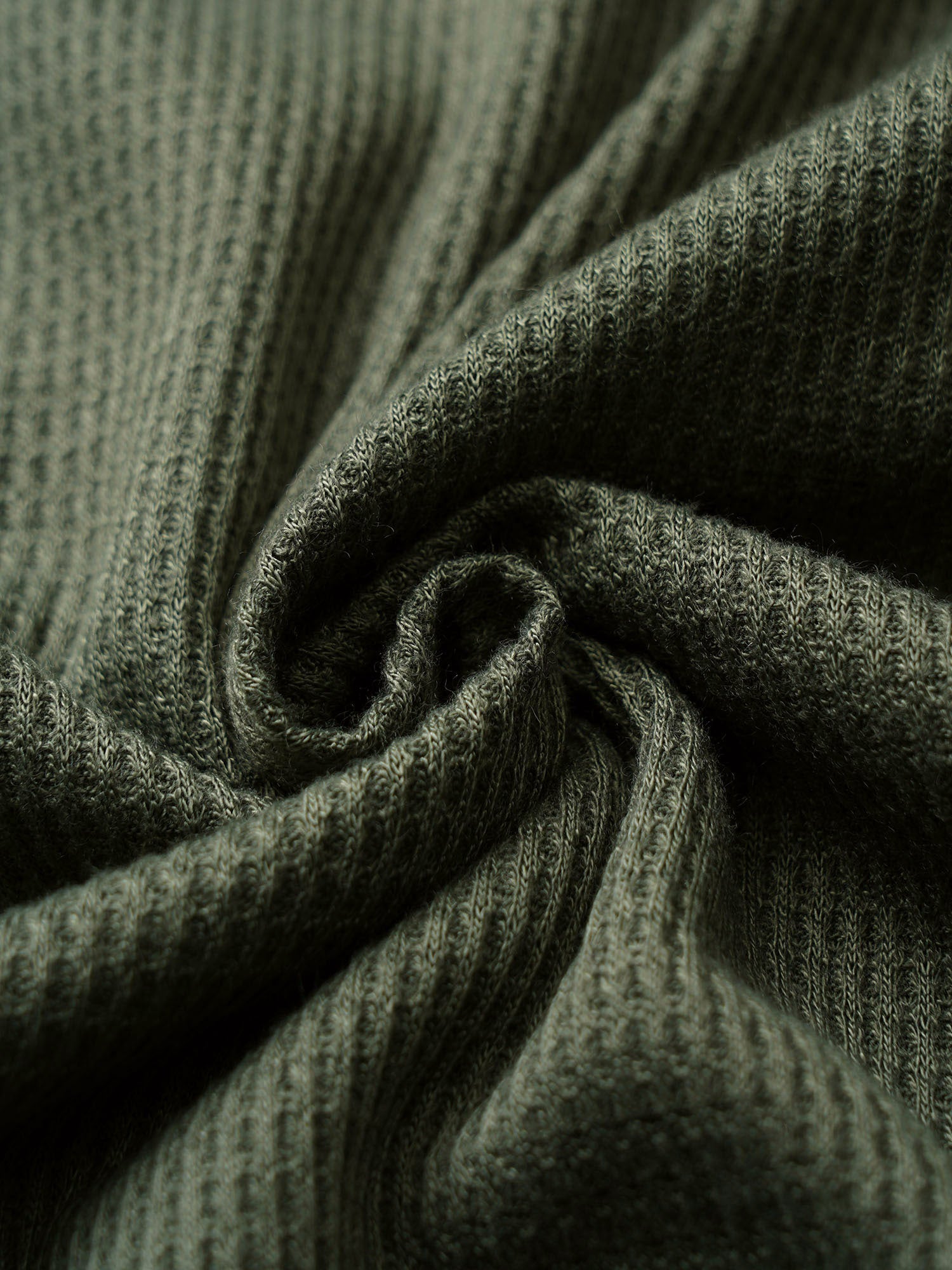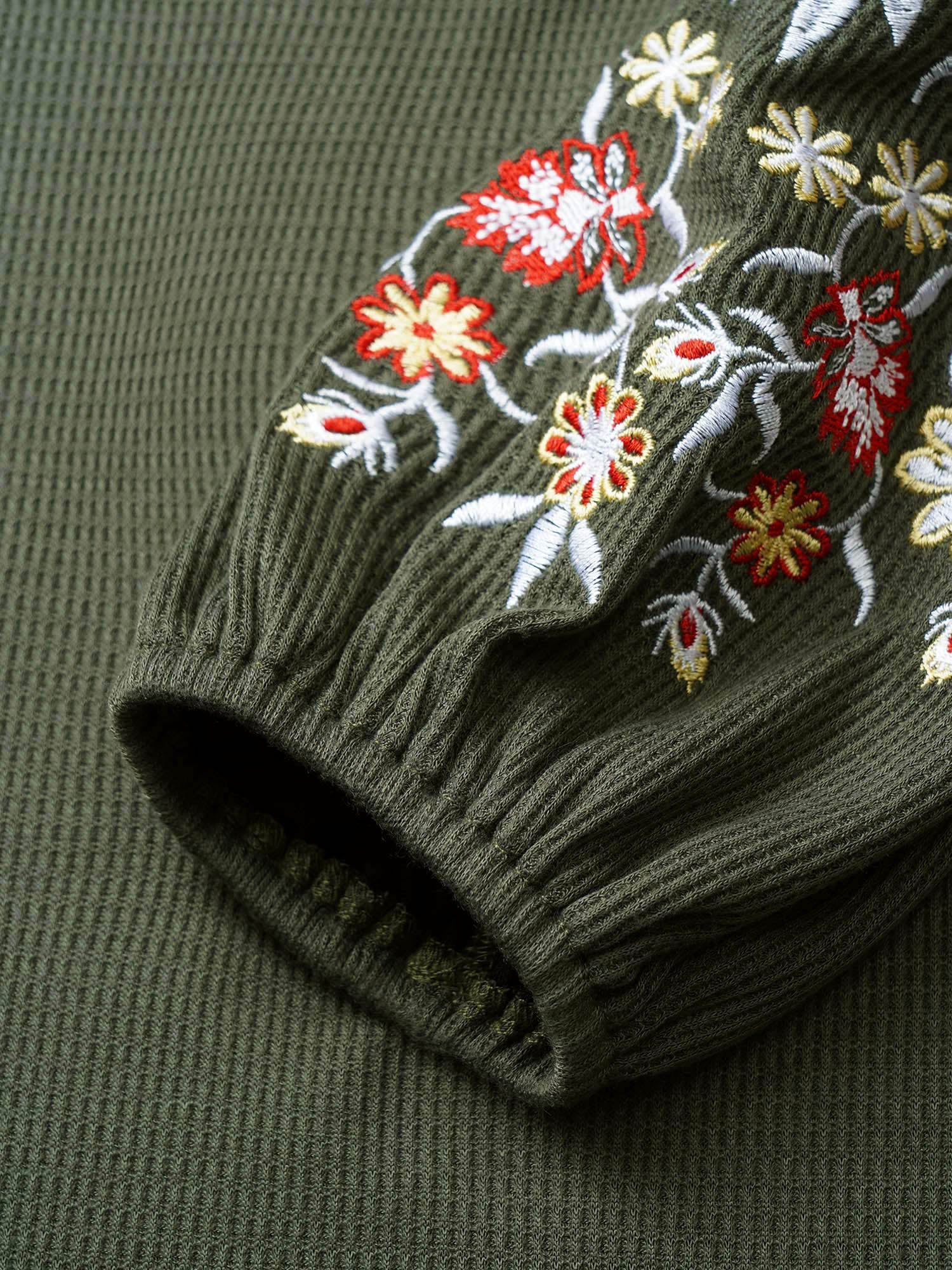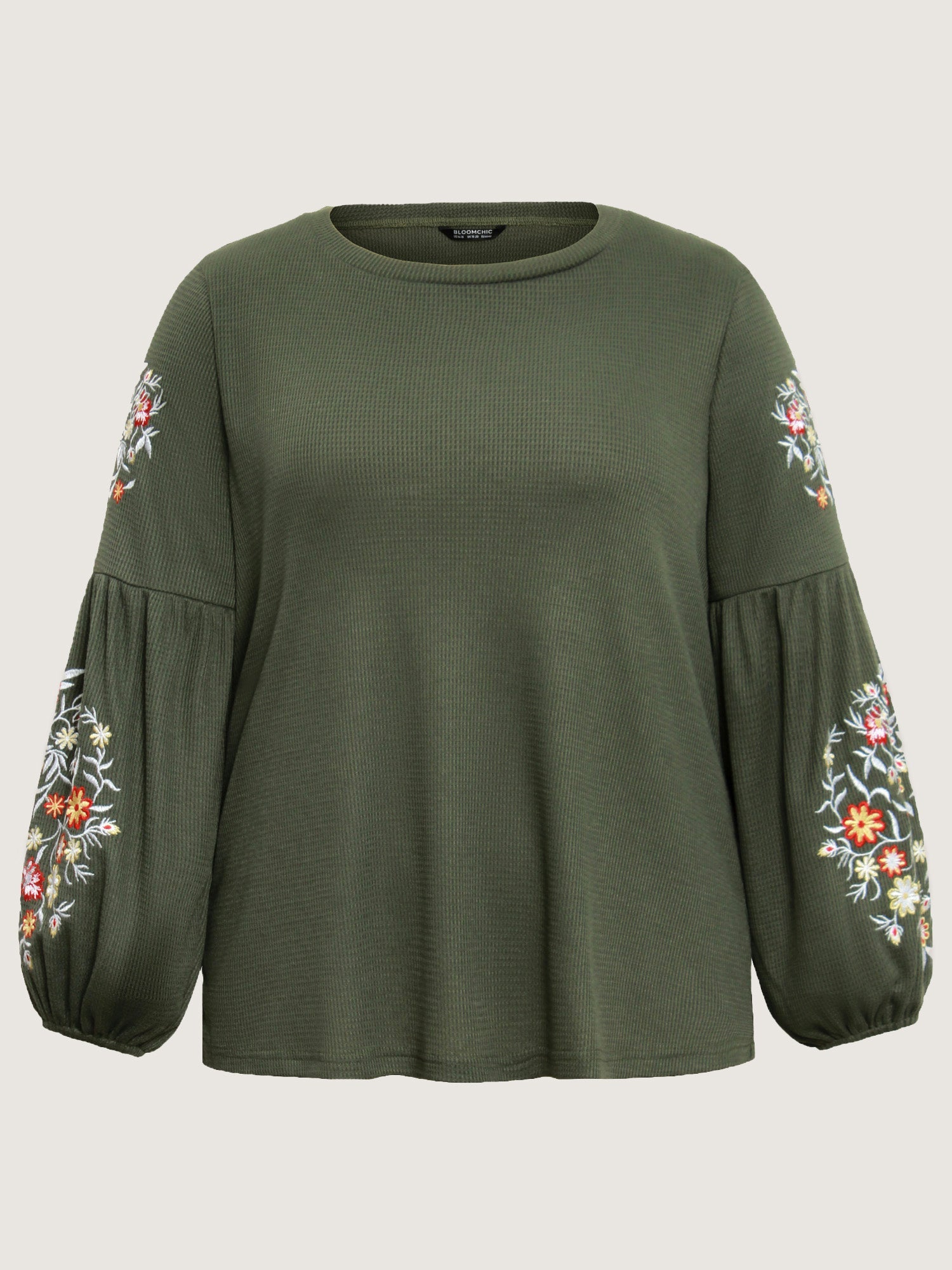 Waffle Knit Floral Embroidered Lantern Sleeve T-shirt